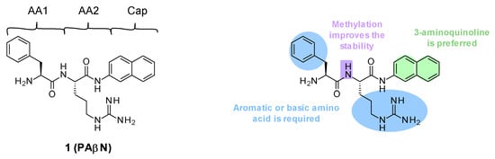 PAβN (1) is a low-molecular-weight dipeptidic compound composed of an L-phenylalanine (AA1) linked to an L-arginine (AA2) substituted by a naphthylamine (Cap) (Figure 1).