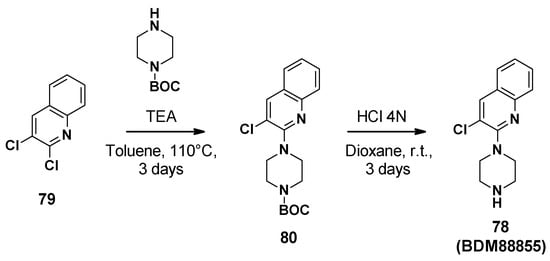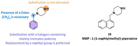 The SAR studies have allowed the discovery of NMP (14, 1-(1-naphtylmethyl)-piperazine) as one of the most potent arylpiperazines (levofloxacin-MRC4 = 50 µg/mL) (Figure 3) [].