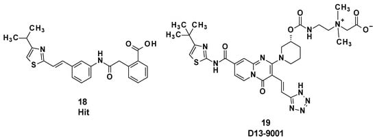 D13-9001 (19) was designed as a specific inhibitor of MexAB-OprM of P. aeruginosa and is characterized by a pyridopyrimidine core (Figure 4). This compound was obtained after optimization of an initial hit compound (18) identified by high-throughput screening.