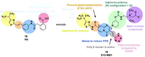 To improve solubility, highly water-soluble moieties, such as quaternary ammonium salt, were added. This led to the identification of D13-9001 (19), a specific inhibitor of MexAB-OprM in P. aeruginosa [] (Figure 5).