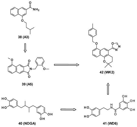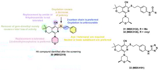 The SARs allowed the discovery of three compounds: MBX3132 (31), MBX3135 (32), and MBX4191 (33) (Figure 6) [].