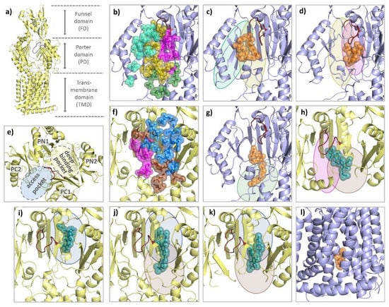 - Schuster, S.; Vavra, M.; Kern, W.V. Evidence of a Substrate-Discriminating Entrance Channel in the Lower Porter Domain of the Multidrug Resistance Efflux Pump AcrB. Antimicrob. Agents Chemother. 2016, 60, 4315–4323. [Google Scholar] [CrossRef]