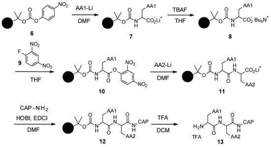 - Léger, R.; Yen, R.; She, M.W.; Lee, V.J.; Hecker, S.J. N-Linked Solid Phase Peptide Synthesis. Tetrahedron Lett. 1998, 39, 4171–4174. [Google Scholar] [CrossRef]