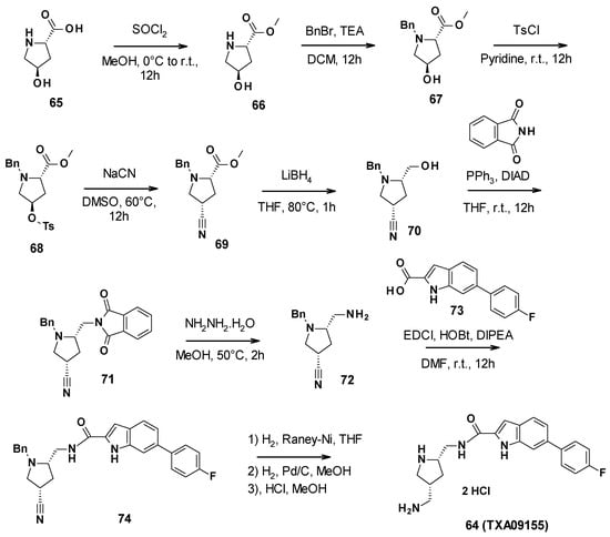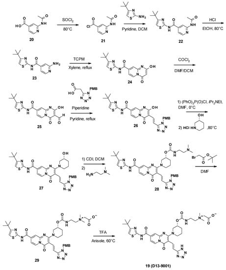 D13-9001 was obtained in a 10-step synthesis starting with 2-acetamidopyridine-4-carboxylic acid (Scheme 3). First, a coupling reaction was performed between 4-tert-butylthiazol-2-amine and the synthesized acyl chloride 21. The aniline was then deprotected by the reaction with ethanol in acidic conditions. This allowed for the formation of the pyridopyrimidine core through the reaction of 23 with bis(2,4,6-trichlorophenyl)malonate (TCPM). Subsequent formylation by the Vilsmeier–Haack reagent formed using phosgene in DMF yielded the corresponding aldehyde intermediate 25. The olefin derivative 26 was then synthesized by condensation with 2-(1H-tetrazol-5-yl)acetic acid protected by a PMB (p-methoxybenzyl) group, followed by decarboxylation. An aromatic nucleophilic substitution with (3R)-piperidin-3-ol hydrochloride was then performed after activation of the phenol with diphenyl phosphoryle chloride to yield intermediate 27. Subsequent reaction with carbonyldiimidazole (CDI) and N′,N′-dimethylethane-1,2-diamine gave the corresponding carbamate 28. The tertiary amine was then alkylated using tert-butyl-2-bromoacetate, leading to ammonium 29. Finally, the tetrazole was deprotected by reaction with trifluoroacetic acid in anisole to yield D13-9001 (19) [].