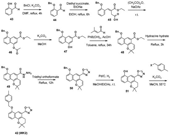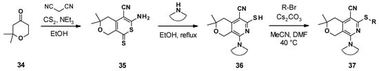 Pyranopyridines were first described in 2014 by the US company MicroBiotix as AcrAB-TolC efflux pump inhibitors in E. coli []. Cell-based high-throughput screening of 183,400 small molecules led to the identification of MBX2319 (30) as a potentiator of ciprofloxacin in E. coli.