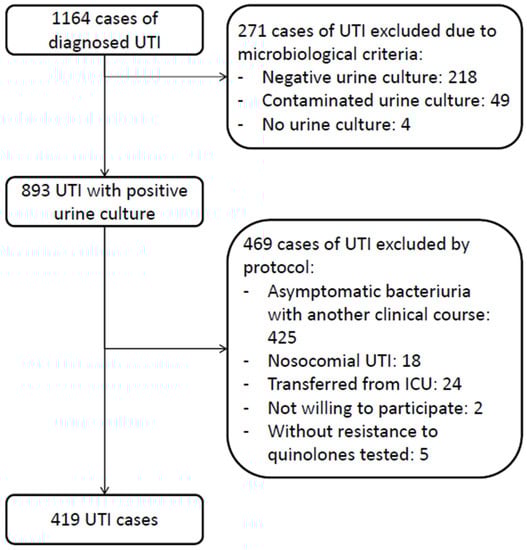 Flowchart of inclusion of 419 cases of complicated community-acquired urinary tract infection.