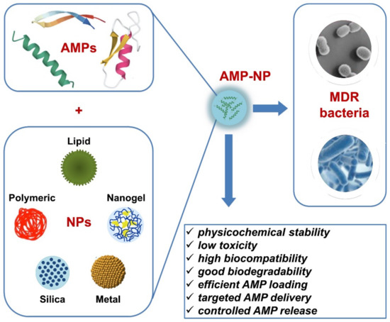 AMPs can be encapsulated within nanoparticles (NPs), thus improving peptide stability and selective cell/tissue targeting, reducing eventual toxicity and exposure to proteolytic enzymes, and promoting, in general, their delivery and therapeutic efficacy. Additionally, NP delivery represents a suitable strategy against the progress of AMR. A targeted drug delivery, together with a controlled release from NPs, should guarantee the presence of AMP therapeutic doses around the pathogen microenvironment and avoid suboptimal ones which can lead to the selection of resistant microbial mutants without killing the target.