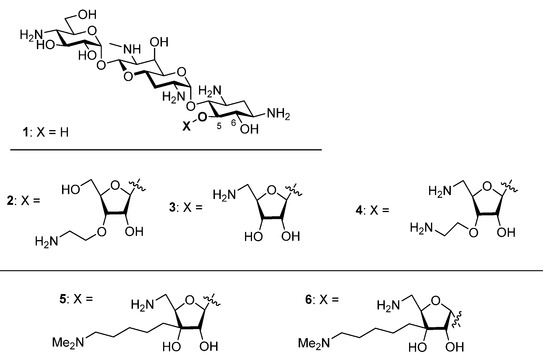Apramycin 1, Apralogs 2–4, and the Target Compounds 5 and 6.