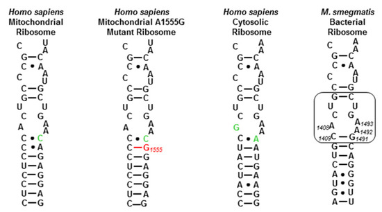 - Hobbie, S.N.; Bruell, C.M.; Akshay, S.; Kalapala, S.K.; Shcherbakov, D.; Böttger, E.C. Mitochondrial Deafness Alleles Confer Misreading of the Genetic Code. Proc. Natl. Acad. Sci. USA 2008, 105, 3244–3249. [Google Scholar] [CrossRef] [PubMed]