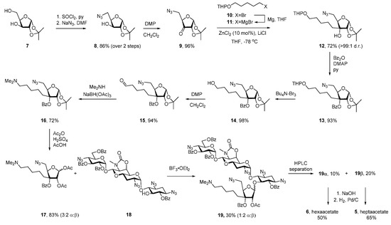 Apralogs 5 and 6 were synthesized by glycosylation of selectively protected apramycin derivative 18 with glycosyl donor 17 as the key step (Scheme 1). Alcohol 18 was accessed from apramycin 1 in four steps as described previously [25,26], whereas 3C-aminoalkyl ribofuranose 17 was synthesized from protected xylofuranose 7 (Scheme 1). Thus, treatment of 7 with thionyl chloride in pyridine furnished cyclic sulfite [27] that was further reacted with NaN3 to afford 8 in 86% yield. Subsequent oxidation with Dess-Martin periodinane (DMP) delivered ketone 9 that underwent highly stereoselective addition of Grignard reagent 11, prepared from THP-protected bromopentanol 10 [28] and metallic magnesium. Subsequent benzoyl protection of the resulting tertiary alcohol was followed by THP cleavage with Bu4N-Br3 and oxidation of the so-formed primary alcohol to aldehyde 15 in 86% yield over three steps from 12. The desired N,N-dimethylamino moiety was installed by reductive amination of 15 in 72% yield, after which a swap of the acetonide protection for the corresponding 2,3-diacetate delivered glycosyl donor 17 in 83% yield as a 3:2 mixture of α:β-anomers.