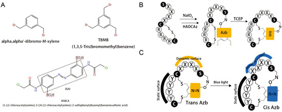 Photoconversion cyclic peptide [44]. (A) Structures of the compounds. (B) A tridentate C2-symmetric hydroxyl amine and dichlorobenzene containing an azobenzene (HADCAz) LR linker with two orthogonally reactive functionalities. (C) Reversible isomerization from the trans to cis form upon irradiation with blue light (365 nm).