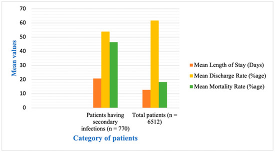 | Serial No. | Category | Critical or Severe n (%age) | Moderate or Mild n (%) | Mean Length of Stay (Days) | Mean Discharge Rate (%age) | Mean Mortality Rate (%age) |