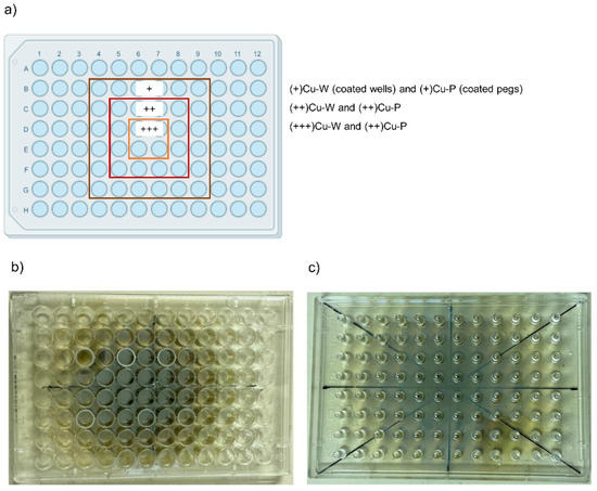 The three areas (a) on the Calgary Biofilm Device coated with copper on wells (b) and pegs (c). The boxes containing the indication (+)Cu, (++)Cu, and (+++)Cu correspond to the wells/pegs in the CBD areas that have coatings with the same concentrations, i.e., low Cu concentration for (+)Cu, medium Cu concentration for (++)Cu, and high Cu concentration for (+++)Cu.