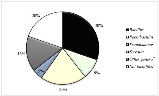 Identification by MALDI-TOF at genus level of these 132 putative antimicrobial-producing isolates detected in soil samples revealed 19 genera and 48 species with the following microbial diversity (number of isolates): Acinetobacter (1), Arthrobacter (2), Bacillus (40), Bradybacterium (1), Brevibacillus (1), Enterobacter (3), Escherichia (2), Klebsiella (1), Microbacterium (2), Micrococcus (1), Paenibacillus (12), Pseudomonas (27), Staphylococcus (2), Serratia (6), Stenotrophomonas (1), Streptomyces (1), Olivibacter (1), Variovarax (1) and Viridibacillus (1). Moreover, 26 out of the 132 isolates (19.7%) could not be identified by MALDI-TOF mass spectrometry (Table 1). Diversity at genera level is represented in Figure 1, where the number of isolates of Bacillus, Paenibacillus, Pseudomonas, Serratia as well as those unidentified are shown. Genera with low numbers of representants were considered together in a group called “Others” (n = 19 isolates). A high prevalence of the genus Bacillus followed by Pseudomonas, Paenibacillus and Serratia (all isolates belong to the species S. plymuthica) is of note.