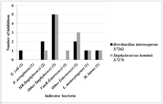 Number of indicator bacteria inhibited by the two highly producing isolates (Brevibacillus laterosporus X7262 and Staphylococcus hominis X7276).