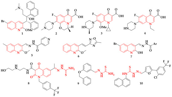Tuberculosis-related literature suggests the N-heterocyclic structures are ideal pharmacophoric scaffolds for anti-TB molecules [18,19]. Moreover, the quinolones and their oxo-derivatives are the principal functional group for several drugs used as second-line antibiotics against tuberculosis, among them, bedaquiline 1 [20], ofloxacin 2 [21], gatifloxacin 3 [22], and norfloxacin 4 [23], used for the treatment of MDR-TB, and other structures such as 5 [24], 6 [25], and 7 [26] are reported as promising inhibitors of M. tuberculosis H37Rv (Figure 1). Furthermore, it has been shown that the thiosemicarbazide nucleus allows the generation of compounds with a broad pharmacological spectrum; specifically, thiosemicarbazones have various biological characteristics such as antitumor [27], antiprotozoal [28], antiviral, and antibacterial [29], and their anti-TB properties stand out [30]. For example, hybrids such as quinoline–thiosemicarbazones 8 [31], benzaldehyde thiosemicarbazones 9 [32], and thiosemicarbazones 10 [33] have been reported as excellent inhibitors of M. tuberculosis.