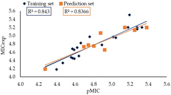 In addition, Tropsha’s test validates [45] and the accuracy of predicting pMIC values for model 3. This model met all the test requirements, suggesting an accurate prediction (Table 3).