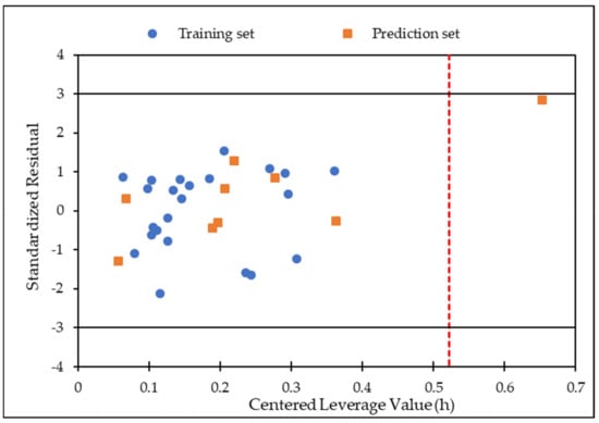 Applicability domain plot of standardized residuals versus centered leverage value of model 3.