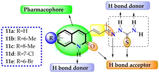 According to Figure S2, the designed compounds could be divided in two kinds: the first one, corresponding to compounds 11b and 11c, exhibiting the HOMO (highest energy occupied orbital) and LUMO (unoccupied orbital of lower energy) distributed among all the structure; in this sense, these compounds might act as nucleophilic (hydrogen acceptor) or electrophilic (hydrogen donor) with the biological target by using both quinolinone and thiosemicarbazide parts on the molecule. In contrast, in the second kind, the electron-withdrawing substituents shift the HOMO to the thiosemicarbazone moiety. In line with these results, the designed compounds meet some characteristics in agreement with the already reported anti-TB compounds. Moreover, compounds 11d and 11e exhibited the HOMO shape more closely than nitro-substituted 1,3-benzothiazoles (BTZ043), a compound family inhibiting the DprE1 protein. These results confirm that the designed compounds meet the electronic characteristic to become molecules potentially active against M. tuberculosis.