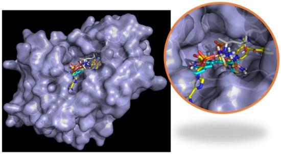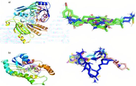 Binding orientation for the most active poses: (a) left, DprE1; right, overlap of the studied compounds with the co-crystallized inhibitor (BTZ043, blue); (b) left, InhA; right, the overlay of all studied compounds with the co-crystallized inhibitor (INH-NADP, blue).