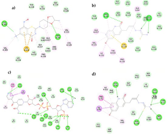 In addition, the presence of a π-sulfur interaction (Lys438) can be noted; a strong hydrophobic interaction (Figure 6a). Similarly, in Figure 6b, compound 11e presents the formation of several van der Waals interactions, such as hydrogen bonds (Arg58, Arg54, and Ala53) and a strong π-sulfur type interaction (Cys129). These results show that compound 11e presents the same interactions as the co-crystalized inhibitor but forms different residues within the catalytic pocket. On the other hand, Figure 6c,d shows the molecular interactions between the InhA-NADP complex and compound 11e with the active site of the InhA protein, respectively. It can be noted that the inhibition of this protein by the Inha-NADP complex takes place mainly through dipolar hydrogen bond-type interactions. However, some hydrophobic interactions are essential, such as the formation of π-π bonds and σ-π with amino acids Phe43 and Ile95, respectively.