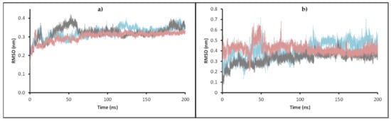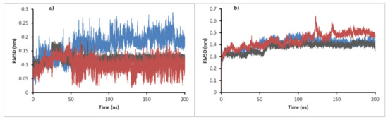 The results show that the enoyl-ACP reductase reached an equilibrium after 60 ns of simulation at a RMSD value of around 0.3 nm for the three systems. This result suggests that the enzyme does not experience significant conformational changes when interacting with the ligands, which may indicate the possibility of positive interaction with them, translating into a potential inhibition of the enzyme. Analyzing the RMSD of the ligands, values below 0.7 nm were found, which supports the reliability of the docking results previously found. Furthermore, low RMSD values also suggest that the complex formed presents a good stability over time, which supports the possible inhibition. A close inspection at the final step over 200 ns simulation showed that the three ligands stayed in the active site, overlaying between them and with the ligand present in the experimental crystal structure (Figure 8).
