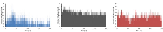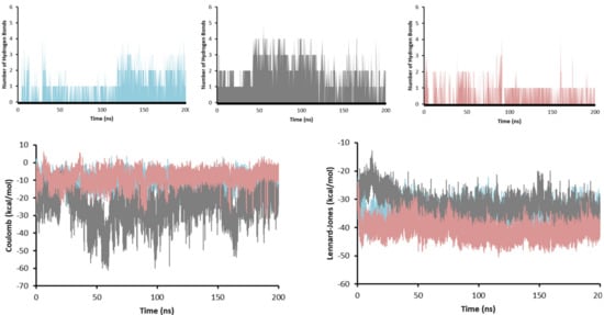 To obtain insights on the strength of the interactions, the number of hydrogen bonds (HBs), and the interaction energies (Coulomb and Lennard-Jones) were obtained for the system during the whole length of the simulation (Figure 9).