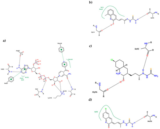 2D Representation of the interaction between enoyl-acyl reductase and (4S)-isonicotinic-acetyl-nicotinamide-adenine dinucleotide (a), 11c (b), 11d (c), and 11e (d).