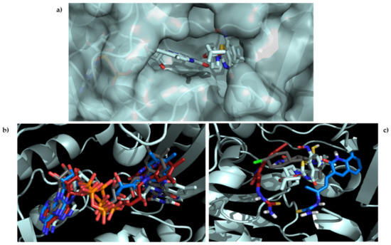 Furthermore, due to FAD’s large size, which manages to penetrate deep inside the enzyme, and the multiple functional groups that can quickly form hydrogen bonds with the enzyme, a stable and robust interaction was very likely to be developed, constraining its movement. On the other side, comparing the final pose of the ligand in the active site with the experimental one found in 6HEZ, a good overlay was not found, although they managed to stay inside the pocket (Figure 11c). This behavior was probably related to the lack of interactions between the ligand and the enzyme. Still, the few interactions with the enzyme and possible interactions with the cofactor may be strong enough to keep the ligand in the active site inhibiting the enzyme.