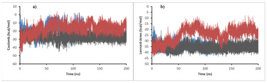 (a) Coulomb energy plot and (b) Lennard-Jones short-range energies of 11c (blue), 11d (gray), and 11e (red) in complex with DprE1 during the 200 ns of simulation.