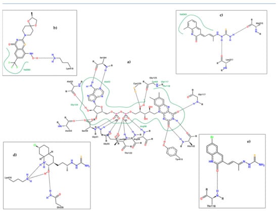 2D Representation of the interaction between DprE1 and FAD (a), BTZ043 (b), 11c (c), 11d (d), and 11e (e).