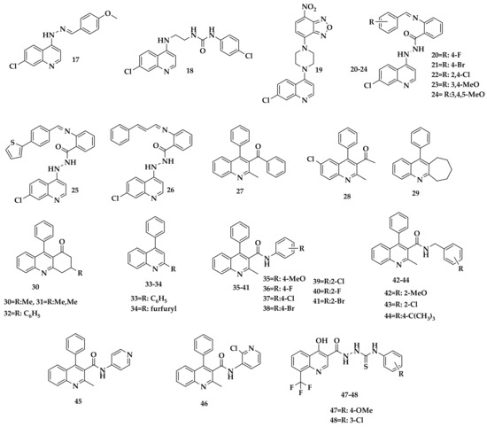 - Nayyar, A.; Malde, A.; Coutinho, E.; Jain, R. Synthesis, Anti-Tuberculosis Activity, and 3D-QSAR Study of Ring-Substituted-2/4-Quinolinecarbaldehyde Derivatives. Bioorg. Med. Chem. 2006, 14, 7302–7310. [Google Scholar] [CrossRef]