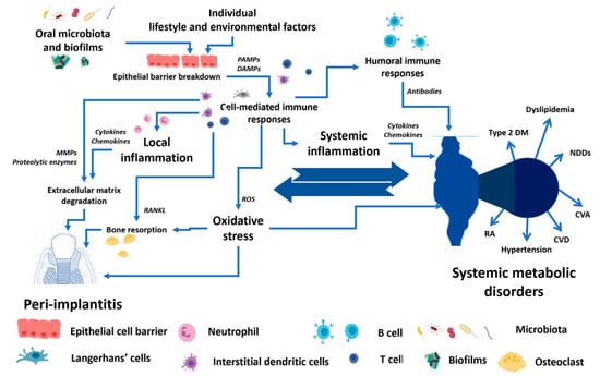 The conceptual framework of the bi-directional relationship between peri-implantitis and systemic metabolic disorders. PAMPs—Pathogen-associated molecular patterns, DAMPs—Damage-associated molecular patterns, MMPs—Matrix metalloproteinases, RANKL—Receptor activator of nuclear factor-κB ligand, ROS—Reactive oxygen species, Type 2 DM—Type 2 diabetes mellitus, NDDS—Neurodegenerative disorders, CVA—Cerebrovascular accident, CVD—Cardiovascular diseases, RA—Rheumatoid arthritis.