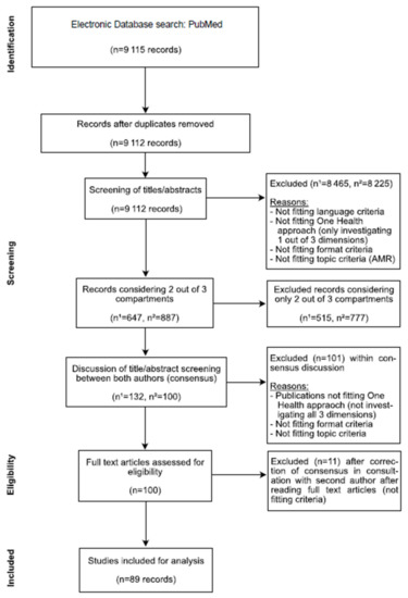 From an initial dataset of 9115 different publications that fit our search criteria (investigation of antimicrobial resistance in at least two of the three compartments as mentioned above), we finally included a total of 89 different publications into our systematic review (see Figure 1). The 89 publications analyzed include papers fulfilling the following criteria: papers that investigate all three compartments simultaneously (human, animal and environment); and only papers that provide primary data and an investigation of isolates, with regard to their resistance patterns and theoretical scenarios (e.g., epidemiological modeling).