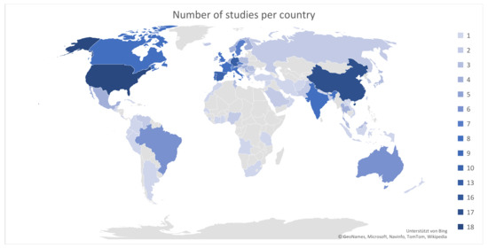 Number of studies per country (color coded). Grey color means that no studies that fit inclusion criteria were available.