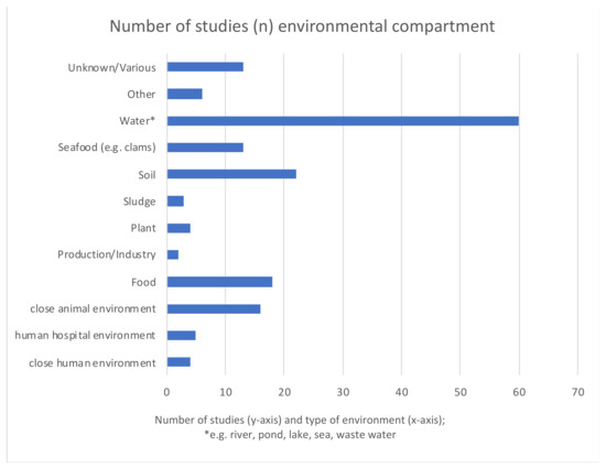| Environmental sectors | Most studies were on water (67%), soil (26%), food (20%) and close animal environment (18%) | Other sectors were human hospital environment, close human environment, plant, sludge, sea food and industry |