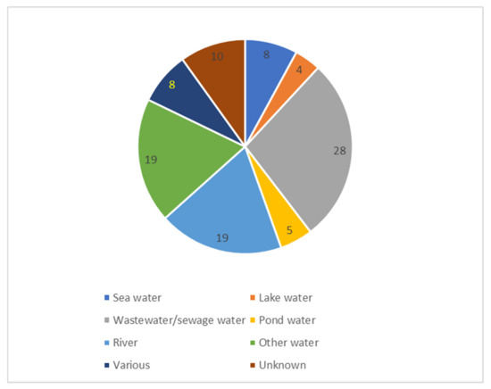 | Water | Wastewater was most often examined (31% of the studies) | Other water sources were sea, lake, pond and river water |