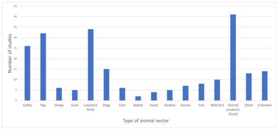 Number of studies (y axis) per type of animal sectors (x axis) represented in all 89 studies included. “Animal products” comprised the following: Meat (chicken, turkey, duck, sheep, cattle/beef, fish, pork, offal, not specified), chicken eggs, dairy products (cheese, milk, not specified), and unknown/various. “Livestock birds” comprised the following: Chicken, duck, turkey, goose, ostriches, and other (Hoatzin Cecum). “Fish” compromised the following: Rutilus rutilus, wild eels, salmon, and freshwater fish. “Other” comprised the following: Frog, monkeys, wild boars, peacock, parrot, snake, buffaloes, turtles, red fox, dinoflagellate, dolphin, whales, wolf, other domestic birds, shells, and “other reptiles”.
