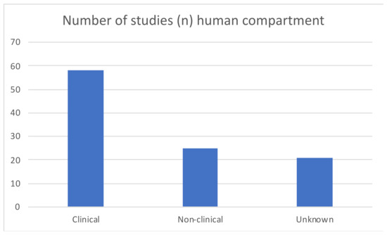 The human sector consisted of samples (e.g., blood, feces, urine) from individuals of different ages, health status and country of origin. A large majority of studies (65%) investigated clinical samples of the human population (see Figure 7). Clinical samples are defined as samples coming from hospitals/in a medical context, e.g., blood or urine samples in clinics. Non-clinical samples were samples from people at home/community, and that did not have a hospital context.