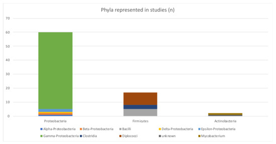 A large variety of 15 different bacteria genera (see Figure 8) in three phyla (Proteobacteria, Firmicutes and Actinobacteria, in descending order; see Figure 9) (not considering unknown bacteria and metagenomic datasets) were investigated in the included studies.