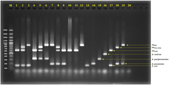 Agarose gel electrophoresis of multiplex PCR-amplified products; lane 1 = Isolate No. C76 (E. coli with NDM), lane 2 = Isolate No. C163 (E. coli with NDM and OXA-48-like), lane 3 = Isolate No. C1992 (E. coli with KPC), lane 4 = Isolate No. C34 (K. quasipneumoniae with NDM), lane 5 = Isolate No. C110 (K. quasipneumoniae with NDM and OXA-48-like), lane 6 = Isolate No. AMR353 (K. quasipneumoniae with KPC), lane 7 = Isolate No. C1985 (K. pneumoniae with KPC), lane 8 = Isolate No. C73 (K. pneumoniae with NDM and OXA-48-like), lane 9 = Isolate No. C75 (K. pneumoniae with NDM), lane 10 = Isolate No. C19 (E. cloacae with NDM), lane 11 = Isolate No. C487 (C. freundii with NDM), lane 12 = Isolate No. C2135 (E. asburiae with KPC), lane 13 = E. coli ATCC25922, lane 14 = K. pneumoniae ATCC27335, lane 15 = K. quasipneumoniae ATCC700603, lane 16 = K. variicola ATCC-BAA830, lane 17 = E. coli ATCC-BAA2469 (contain NDM), lane 18 = K. pneumoniae ATCC-BAA2524 (contain OXA-48), lane 19 = K. pneumoniae ATCC-BAA1705 (contain KPC), lane 20 = negative control, and lane M = 100 bp DNA ladder.