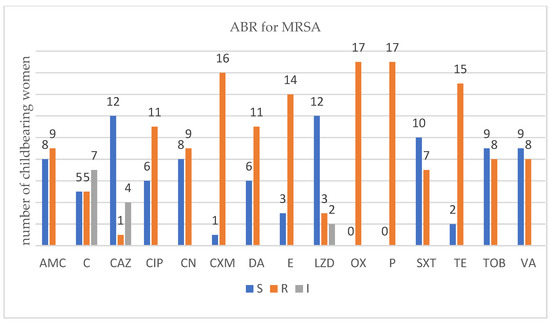There were 17 childbearing women that carried MRSA. All of them displayed several degrees of resistance toward antibiotics. Fisher’s exact test was applied, and a statistically significant association between the number of ABR- and MRSA-carrying patients appeared, p = 0.0001. MRSA strains exhibited the highest number of antibiotic resistances. The most common resistances encountered were against clinically relevant antibiotics such as oxacillin (all 17 strains), penicillium (all 17 strains), cefuroxime (16 strains), tetracycline (15 strains), erythromycin (14 strains), and, more importantly, a last resort antibiotic such as vancomycin (8 strains).
