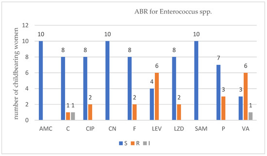 For Enterococcus spp. in the group of ten women that were infected with this type of bacteria, six VRE strains were detected. Applying Fisher’s exact test, no association was found between the number of ABR and VRE, p = 0.2090.