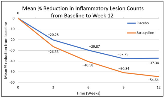 For the facial inflammatory lesion count, statistically significant reduction was observed at week 3 by 26% vs. 20%, (confidence interval (CI): −6.06 (−11.45, −0.66), p = 0.0279), at week 6 by 41% vs. 30% (CI: −10.70 (−16.48, −4.93), p = 0.0003), at week 9 by 51% vs. 38% (CI: −13.09 (−19.18, −6.99), p < 0.0001), and at week 12 by 55% vs. 37% (CI: −17.29 (−24.39, −10.20), p < 0.0001) in patients on sarecycline vs. placebo, respectively (Figure 1).