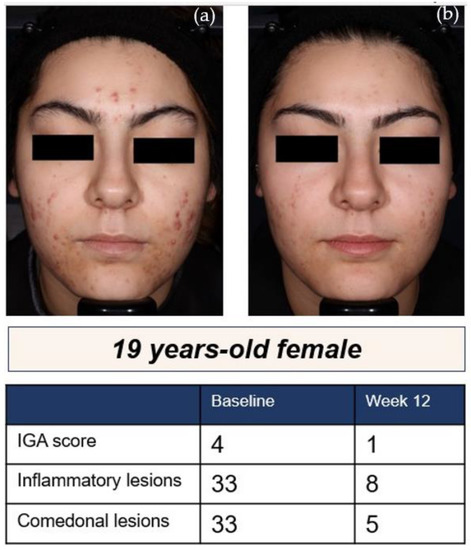 Figure 2. A 19-year-old Hispanic female [8]: (a) at baseline and; (b) after 12 weeks of treatment with sarecycline 1.5 mg/kg/day.