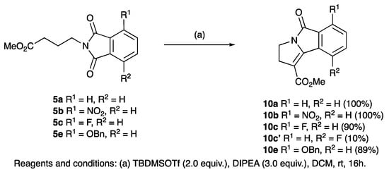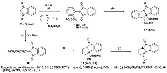 - Kim, G.; Keum, G. A new route to quinolone and indole skeletons via ketone-and ester-imide cyclodehydration reactions. Heterocycles 1997, 45, 1979–1988. [Google Scholar] [CrossRef]