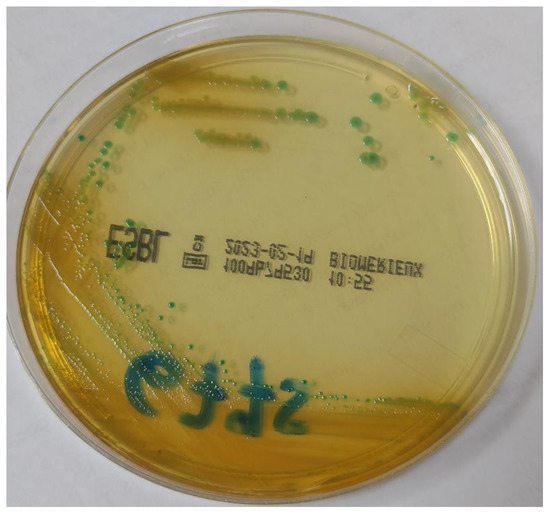 Surveillance rectal swabs were cultured on chromID ESBL Agar (BioMerieux, Marcy-l’Etoile, France). Flat blue-green colonies grew after incubation at 37 °C for 18 h (Figure 1). Species identification was performed through MALDI-TOF mass spectrometry (Bruker Daltonics GmbH, Bremen, Germany) equipped with Bruker Biotyper 3.1 database. The isolate 6775PV was identified as Pantoea agglomerans (score 1.828), but scores between 1.7 and 1.99 indicate “probable genus identification”, thus the strain was reported as Pantoea spp.