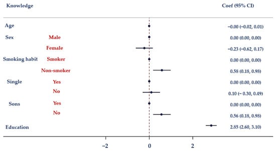 In the results presented in Table 5, Model I revealed an association between education level and knowledge about antibiotics. These findings are coherent with several previous studies which found that college graduates tend to have higher levels of knowledge about antibiotics compared to those with less education [,,,]. The positive correlation observed between education level and knowledge about antibiotics can be attributed to various factors, including improved health literacy, greater exposure to scientific information, and access to academic resources like publications and peer-reviewed journals [,]. However, it is essential to recognize that educational opportunities are not equally distributed globally, and individuals from socio-economically disadvantaged backgrounds may face limited access to education, which can negatively affect their understanding of antibiotics. This knowledge gap can contribute to the overuse and misuse of antibiotics, thereby fostering the development of AMR.