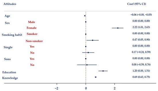 The second piece of evidence, as shown in Table 5, is provided by Model II, which highlights a correlation between non-smoking habits and attitudes toward antibiotics, probably due to more respiratory illnesses occurring among the smoking group. The influence of smoking habits on the usage of antibiotics has been well documented []. This finding highlights the significance of taking smoking behavior into account when studying attitudes and behaviors regarding antibiotic use. Acknowledging the impact of smoking habits on antibiotic attitudes allows for the development of targeted interventions and educational campaigns aimed at promoting responsible antibiotic use among individuals who smoke. By addressing this specific population, we can effectively contribute to the reduction of antibiotic overuse and the preservation of antibiotic effectiveness.