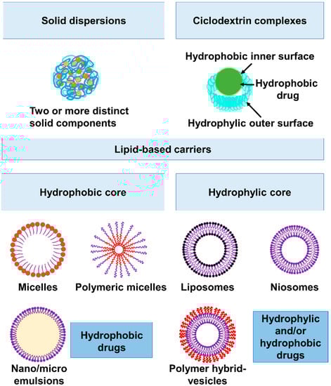 Nanocarriers used to improve drug delivery. Solid dispersions: these are formed by two or more solid components, generally a hydrophilic polymeric matrix (such as PVP or PEG) and a hydrophobic drug. Cyclodextrins: the cylindrical shape allows the drug to be kept within the hydrophobic interior, while the outer surface is hydrophilic and soluble in aqueous solutions. Lipid-based carriers: Micelles, polymeric micelles, and nano- or microemulsions are composed of a monolayer (one or more surfactants) and a hydrophobic core and serve to carry hydrophobic drugs. Vesicles have a hydrophilic core and, according to their composition, can be classified as liposomes (phospholipids), niosomes (non-ionic surfactants with or without cholesterol) or polymer-hybrid vesicles (liposomes or niosomes coated with polymers) and serve to carry hydrophobic or hydrophilic drugs.